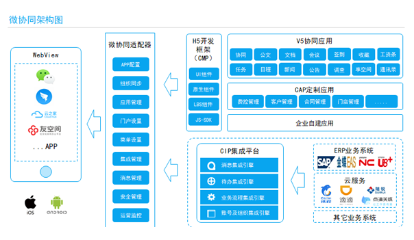 协同产品集成第三方应用、待办、消息支持微协同端客户端,同时微信底导航、企业微信/钉钉工作台支持自定义配置第三方应用入口。